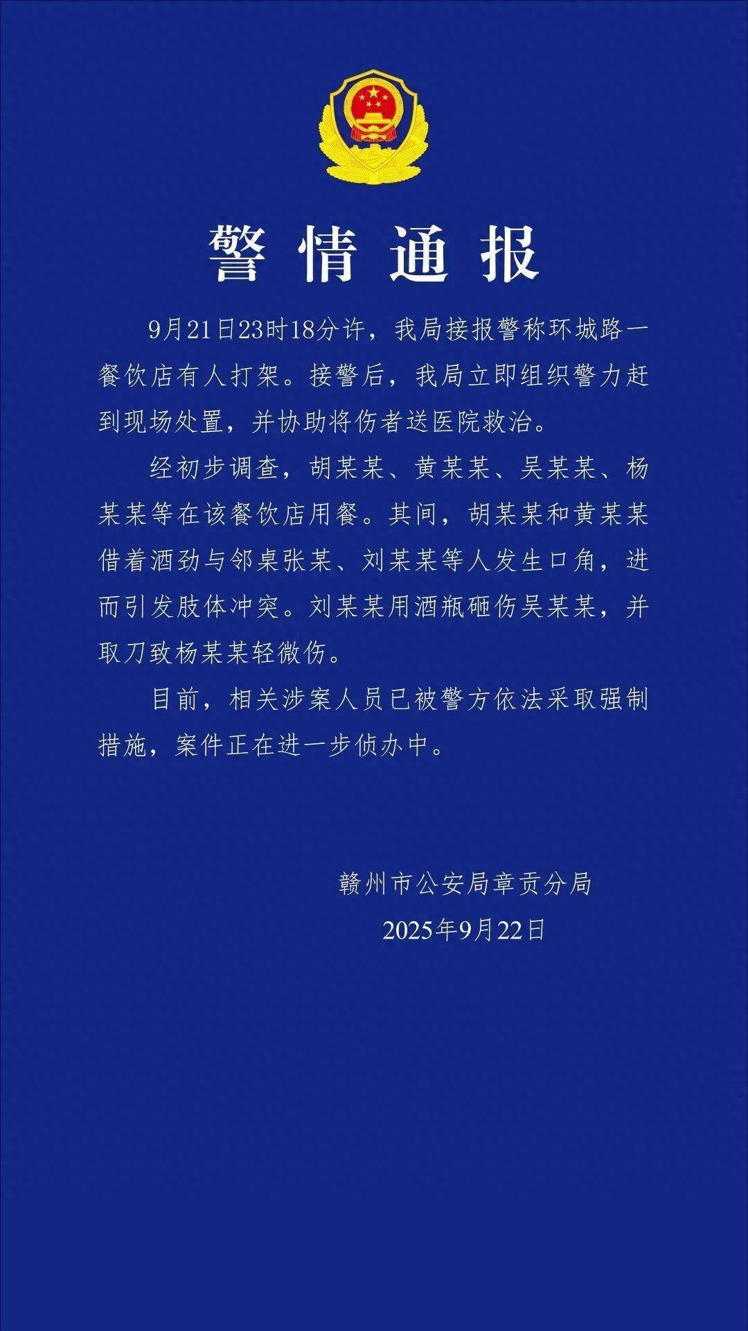 翻翻策略 江西赣州章贡警方通报“一餐饮店有人打架”:涉案人员已被采取强制措施